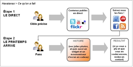 Dans le cas de l’opération Havaianas, nos objectifs étaient de commencer de fédérer des fans de la marque (« brand addicts ») sur 4 pays européens (France, Espagne, Italie, Angleterre) tout en faisant parler de la marque. La mesure de cet objectif n’était pas quanti mais quali (on ne voulait pas de milliers de fans, mais de vraies personnes qui pouvaient parler de la marque et avec la marque.